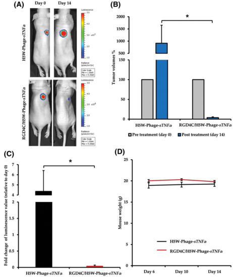 In vivo treatment of chondrosarcoma SW1353-bearing mice with intravenous administrations of RGD4C/H5W-Phage-sTNFα. Tumor-bearing mice were intravenously injected with RGD4C/H5W-Phage-sTNFα or non-targeted H5W-Phage-sTNFα vector. (A) Representative tumor-bearing mice imaged using the in vivo Bioluminescent Imaging System at day 0, before treatment initiation, and day 14, post-vector administration. (B) Average tumor volumes progression in each experimental group. (C) The luminescence values of tumors shown as fold change between pre-treatment day 0 and post-vector treatment day 14. (D) Average weights of SW1353 tumor-bearing mice. Adapted with permission from FASEB. * p < 0.05.