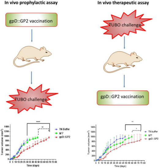 A schematic summary of the breast cancer vaccine study (gpD::GP2) in a TUBO tumor model of BALB/c mice. Adapted with permission from NPG. * p < 0.05, ** p < 0.01 and **** p < 0.0001; denotes significant difference from the control groups.
