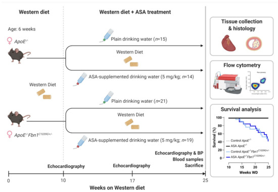 The goal of the present study was to test the effect of low-dose ASA on the progression of vessel wall remodelling, atherosclerosis, and cardiovascular complications in apolipoprotein E deficient (ApoE−/−) mice, the classical model to study atherosclerosis, and ApoE−/− mice with a heterozygous mutation in the fibrillin-1 gene (Fbn1C1039G+/−). Mutations in the Fbn1 gene result in an impaired microfibrillar assembly and deposition, followed by fragmentation of elastic fibres and increased collagen deposition. This loss of structural integrity of the vessel wall leads to progressive dilatation and arterial stiffening, resembling vascular ageing [23,24,25,26,27]. In addition, the ApoE−/−Fbn1C1039G+/− mouse model shows accelerated atherosclerotic plaque progression, spontaneous plaque ruptures, MI, and sudden death [28,29]. It is therefore an excellent model to study pharmacological interventions targeting vascular ageing and CVD, because it combines two important risk factors, hypercholesterolemia (ApoE−/−) and arterial stiffness (Fbn1C1039G+/−).
