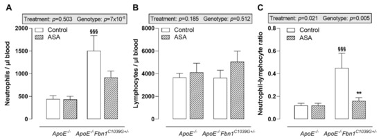 Blood neutrophils and lymphocytes. (A) Circulating neutrophils were higher in control ApoE−/−Fbn1C1039G+/− mice compared to ApoE−/− mice and were not significantly affected by ASA treatment. (B) Absolute numbers of circulating lymphocytes remained equal between all groups of mice. (C) As a result of ASA treatment, the neutrophil–lymphocyte ratio was normalised in ApoE−/−Fbn1C1039G+/− mice. 2-way ANOVA: §§§ p < 0.001 vs. ApoE−/− control and ** p < 0.01 vs. ApoE−/−Fbn1C1039G+/− control.