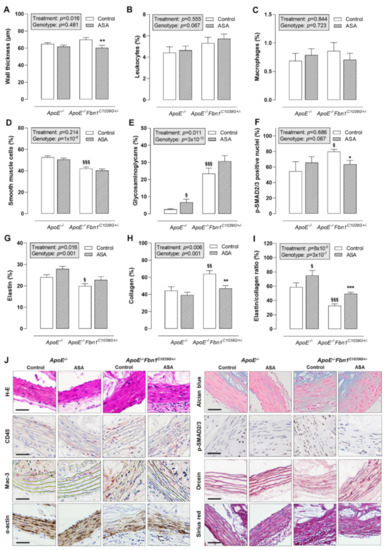 Thickness and composition of the proximal ascending aorta wall. (A) H-E staining was used to evaluate the thickness of the vessel wall, which was reduced as a result of ASA treatment in ApoE−/−Fbn1C1039G+/− mice. (B,C) The percentage of leukocytes (CD45 positive cells) and macrophages (Mac-3 positive area) in the vessel wall did not change. (D) The α-actin positive area (smooth muscle cells) was significantly lower in ApoE−/−Fbn1C1039G+/− mice and was not affected by ASA treatment. (E) Alcian blue staining indicated an increase in glycosaminoglycans in ApoE−/−Fbn1C1039G+/− mice as compared to ApoE−/− mice. In addition, ASA treatment resulted in a higher percentage of glycosaminoglycans in ApoE−/− mice. (F) The percentage of p-SMAD2/3 positive nuclei were higher in ApoE−/−Fbn1C1039G+/− control mice as compared to ApoE−/− mice. ASA treatment was able to reduce p-SMAD2/3 positivity in ApoE−/−Fbn1C1039G+/− mice. (G) Orcein staining clearly showed the fragmentation of elastic fibres and a lower elastin content in ApoE−/−Fbn1C1039G+/− mice, which was not significantly affected by ASA treatment. (H) Collagen content of the vessel wall (Sirius red positive area) was higher in control ApoE−/−Fbn1C1039G+/− mice and normalised by ASA treatment. (I) The elastin/collagen ratio was reduced in ApoE−/−Fbn1C1039G+/− mice and ASA treatment led to an increase in both models. (J) Representative images of the different stainings. Scale bar = 50 µm. 2-way ANOVA: § p < 0.05, §§ p < 0.01 §§§ p < 0.001 vs. control ApoE−/− and * p < 0.05, ** p < 0.01, *** p < 0.01 vs. control ApoE−/−Fbn1C1039G+/−.