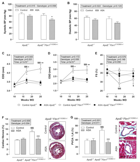 Blood pressure and cardiac remodelling. (A,B) Systolic blood pressure (BP) was lower after ASA treatment in ApoE−/−Fbn1C1039G+/− mice. Diastolic BP was not significantly reduced. 2-way ANOVA: * p < 0.05 vs. control ApoE−/−Fbn1C1039G+/−. (C–E) End-diastolic diameter (EDD) and end-systolic diameter (ESD) were normalised in ASA-treated ApoE−/−Fbn1C1039G+/− mice. A trend towards higher fractional shortening (FS) was observed in ApoE−/−Fbn1C1039G+/− mice treated with ASA. 3-way mixed ANOVA: § p < 0.05, §§§ p < 0.001 vs. control ApoE−/− and * p < 0.05, ** p < 0.01 vs. ASA ApoE−/−Fbn1C1039G+/− (F,G) Total cardiac fibrosis (Trichrome Masson staining; scale bar = 500 µm) was increased in control ApoE−/−Fbn1C1039G+/− mice and normalised after ASA treatment. Trichrome Masson staining of the coronary arteries (scale bar = 50 µm) revealed a significant reduction of perivascular fibrosis (perivascular collagen area divided by luminal area = PVCA/LA) after ASA treatment in ApoE−/−Fbn1C1039G+/− mice. 2-way ANOVA: §§§ p < 0.001 vs. control ApoE−/− and *** p < 0.001 vs. control ApoE−/−Fbn1C1039G+/−.