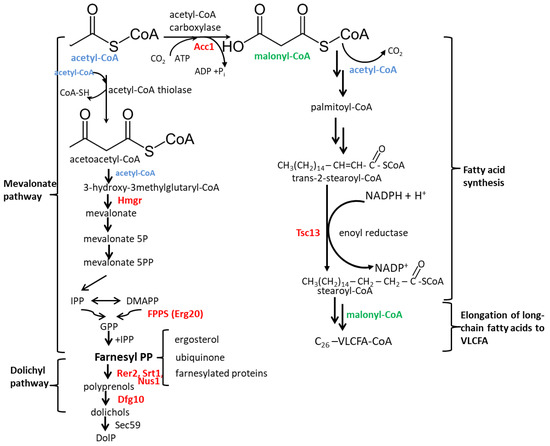 The mevalonate pathway is not the only biosynthetic route commencing with acetyl-CoA. Another common fate of acetyl-CoA is its carboxylation by biotin-dependent acetyl-CoA carboxylase Acc1 (EC 6.4.1.2) to form malonyl-CoA, a universal precursor of fatty acids, used both for their synthesis de novo and elongation to very long-chain fatty acids (VLCFA) [8,9].