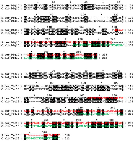 Alignment of putative C. albicans Dfg10 and Tsc13 amino acid sequences compared to the S. cerevisiae homologues. The 3-oxo-5-alpha-steroid 4-dehydrogenase C-terminal domain is in red and green. Identical amino acids and those of similar chemical character are marked by black background.