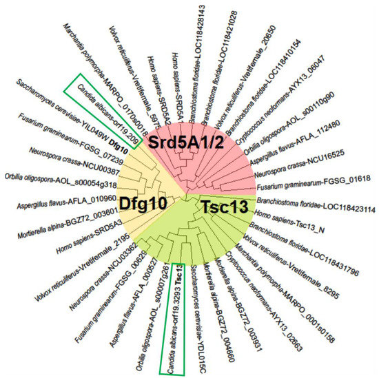On the other hand, human SRD5A1 and SRD5A2 steroid 5α reductases [16] also comprising C-terminal 3-oxo-5-alpha-steroid 4-dehydrogenase domain have no homologues in C. albicans and S. cerevisiae while they were revealed for filamentous fungi (Figure 3, pink background). Phylogenetic analysis showed that the C. albicans proteins encoded by orf.19.209 and orf.19.3293 are closely related to Dfg10 and Tsc13 from S. cerevisiae, respectively (Figure 3, yellow and green background).