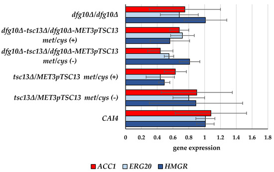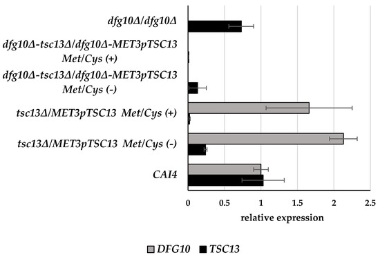 To quantify expression of DFG10 (orf19.209) and TSC13 (orf19.3293) in the wild-type and mutant strains, total RNA was isolated and subjected to RT-qPCR analysis. As expected, no DFG10 transcript was detected in the dfg10∆/dfg10∆ strain. In the tsc13∆/MET3pTSC13 strain grown under non-repressing conditions (without Met or Cys in the medium) the level of TSC13 mRNA was ca. 24% of that in the wild type, while upon repression, the transcript could no longer be detected (Figure 4). Nevertheless, the level of TSC13 expression was apparently sufficient to support growth under these conditions.