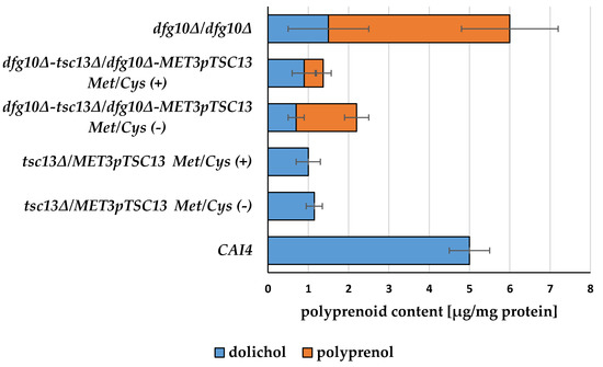 A lowered expression of TSC13 in the dfg10∆/dfg10∆-tsc13∆/MET3pTSC13 mutant decreased the content of dolichols even further, by ca. 30–50% relative to that in dfg10∆/dfg10∆, but also profoundly decreased the abundance of unreduced polyprenols, to ca. 30% of that found in dfg10∆/dfg10∆ without repression of the MET3 promoter and ca. 12% when the expression of MET3pTSC13 was repressed. As a consequence, the overall content of polyprenoids decreased to 37% and 23% of that in dfg10∆/dfg10∆-tsc13∆/MET3pTSC13 under, respectively, non-repressing and repressing conditions.
