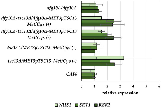 Unexpectedly, in the tsc13∆/MET3pTSC13 mutant, expression of the DFG10 gene was elevated significantly (by ca. 66–113%) compared to the wild-type strain, in both the repression and derepression conditions.