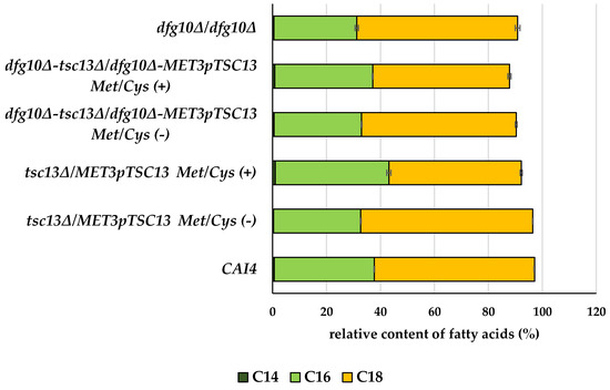 The level of C18 fatty acids was 17.4% lower in the tsc13∆/MET3pTSC13 mutant grown in the repression conditions compared to the wild-type strain. DFG10 depletion did not influence the abundance of C18 fatty acids when compared to the control strain.