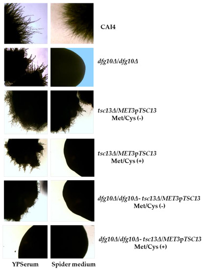 The wild-type strain efficiently formed filaments on both Spider medium and YPSerum while the dfg10∆/dfg10∆-tsc13∆/MET3pTSC13 mutant was unable to do so on either medium supplemented with methionine and cysteine (Figure 9). The ability to form hyphae by the other mutants varied depending on the medium used and/or the extent of TSC13 expression (i.e., the presence of Met/Cys in the medium (Figure 8)).