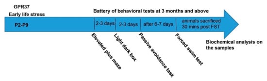 Figure 1 shows the experimental design in which mice WT or GPR37KO mice underwent early life stress followed by a battery of behavioral tests in adulthood before being sacrificed for biochemical analyses.