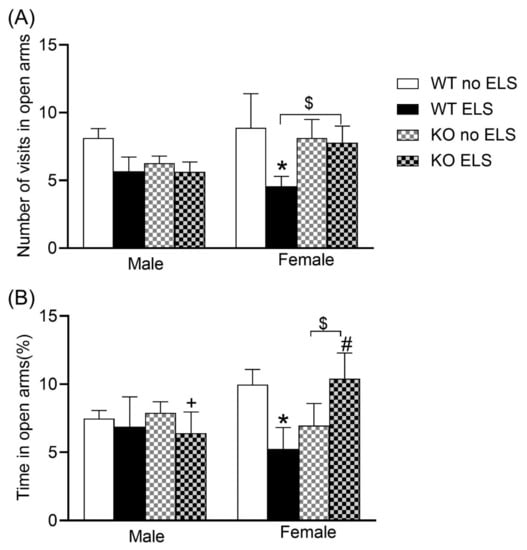 Effect of early life stress on WT and GPR37KO mice in elevated plus maze test. Frequency in open arms (A). Percent time spent in open arms (B). N/group: WT no-ELS male = 8, WT ELS male = 7, KO no-ELS male = 10, KO ELS male = 8, WT no-ELS female = 8, WT ELS female = 7, KO no-ELS female = 8 and KO ELS female = 9. All data represent mean ± SEM. * p < 0.05 treatment difference within genotype; # p < 0.05 versus corresponding WT; + p < 0.05 with respect to sex; $ p > 0.05 < 0.1 calculated by three-way ANOVA followed by multiple comparisons using the two-stage linear step-up procedure of Benjamini, Krieger and Yekutieli. WT = Wild Type, KO = Knockout, ELS = Early Life Stress.