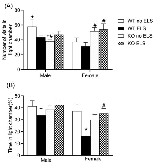 Effect of early life stress on WT and GPR37KO mice on light-dark box test. Frequency in light chamber (A). Percentage time spent in light chamber (B). N/group: WT no-ELS male = 8, WT ELS male = 7, KO no-ELS male = 10, KO ELS male = 10, WT no-ELS female = 8, WT ELS female = 7, KO no-ELS female = 9 and KO ELS female = 9. All data represent mean ± SEM. * p < 0.05 treatment difference within genotype; # p < 0.05 versus corresponding WT; + p < 0.05 with respect to sex; calculated by three-way ANOVA followed by multiple comparisons using the two-stage linear step-up procedure of Benjamini, Krieger and Yekutieli. WT = Wild Type, KO = Knockout, ELS = Early Life Stress.