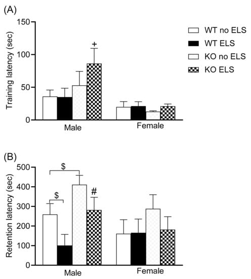 Effect of ELS on WT and GPR37KO mice in passive avoidance task. Training latency (A). Retention latency (B). N/group: WT no-ELS male = 9, WT ELS male = 7, KO no-ELS male = 9, KO ELS male = 10, WT no-ELS female = 8, WT ELS female = 7, KO no-ELS female = 9 and KO ELS female = 9. Results are expressed as mean ± SEM. All data represent mean ± SEM. # p < 0.05 versus corresponding WT; + p < 0.05 with respect to sex; $ p > 0.05 < 0.1 calculated by three-way ANOVA followed by multiple comparisons using the two-stage linear step-up procedure of Benjamini, Krieger and Yekutieli. WT = Wild Type, KO = Knockout, ELS = Early Life Stress.