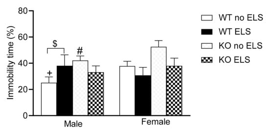 Effect of ELS on WT and GPR37KO mice on time spent immobile in forced swim task. N/group: WT no-ELS male = 8, WT ELS male = 7, KO no-ELS male = 9, KO ELS male = 9, WT no-ELS female = 8, WT ELS female = 7, KO no-ELS female = 8 and KO ELS female = 8. All data represent mean ± SEM. # p < 0.05 versus corresponding WT; + p < 0.05, with respect to sex; $ p > 0.05 < 0.1 calculated by three-way ANOVA followed by multiple comparisons using the two-stage linear step-up procedure of Benjamini, Krieger and Yekutieli. WT = Wild Type, KO = Knock Out, ELS = Early Life Stress.