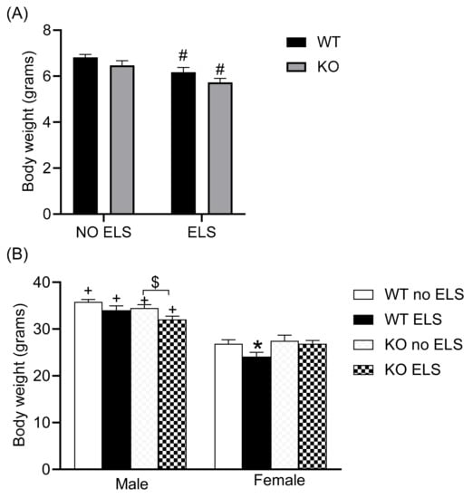 Effect of early life stress in WT and GPR37KO mice on body weight (BW). BW at P12 (A), N/group: WT no-ELS = 22, WT ELS = 16, KO no-ELS = 14, KO ELS = 11. BW of adult mice (B), N/group: WT no-ELS male = 10, WT ELS male = 10, KO no-ELS male = 10, KO ELS male = 7, WT no-ELS female = 11, WT ELS female = 7, KO no-ELS female = 12 and KO ELS female = 8. All data represent mean ± SEM. * p < 0.05 treatment difference within genotype, # p < 0.05 versus corresponding WT; + p < 0.05, with respect to sex, $ p > 0.05 < 0.1 calculated by two-way ANOVA/three-way ANOVA followed by multiple comparisons using two-stage linear step-up procedure of Benjamini, Krieger and Yekutieli. WT = Wild Type, KO = Knockout, ELS = Early Life Stress.