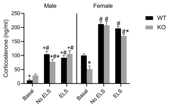 Effect of ELS in WT and GPR37KO mice on corticosterone levels in adulthood. N/group: WT no-ELS male = 5, WT ELS male = 6, KO no-ELS male = 7, KO ELS male = 5, WT no-ELS female = 5, WT ELS female = 7, KO no-ELS female = 7 and KO ELS female = 7. All data represent mean ± SEM. * p < 0.05 treatment difference within genotype; # p < 0.05 versus corresponding WT; + p < 0.05, with respect to sex; calculated by three-way ANOVA followed by multiple comparisons using two-stage linear step-up procedure of Benjamini, Krieger and Yekutieli. WT = Wild Type, KO = Knockout, ELS = Early Life Stress.