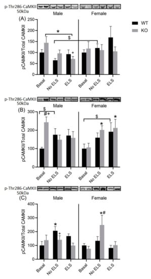 Effect of early life stress in WT and GPR37KO mice on the expression of P-T286-CaMKII/total CaMKII in the dorsal hippocampus (A); WT basal male = 6, WT no-ELS male = 7, WT ELS male = 6, KO basal male = 7, KO no-ELS male = 7, KO ELS male = 6, WT basal female = 6, WT no-ELS female = 6, WT ELS female = 6, KO basal female = 6, KO no-ELS female = 6 and KO ELS female = 6. Ventral hippocampus.(B); WT basal male = 6, WT no-ELS male = 6, WT ELS male = 7, KO basal male = 7, KO no-ELS male = 7, KO ELS male = 6, WT basal female = 6, WT no-ELS female = 6, WT ELS female = 5, KO basal female = 6, KO no-ELS female = 6 and KO ELS female = 6 and amygdala (C) WT basal male = 6, WT no-ELS male = 7, WT ELS male = 6, KO basal male = 7, KO no-ELS male = 6, KO ELS male = 5, WT basal female = 7, WT no-ELS female = 7, WT ELS female = 5, KO basal female = 6, KO no-ELS female = 8 and KO ELS female = 5 All data represent mean ± SEM. * p < 0.05 versus corresponding WT; # p < 0.05, treatment difference within genotype; + p < 0.05, with respect to sex; $ p > 0.05 < 0.1 calculated by three-way ANOVA followed by multiple comparisons using two-stage linear step-up procedure of Benjamini, Krieger and Yekutieli. WT = Wild Type, KO = Knock Out, ELS = Early Life Stress.