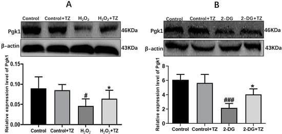 Effect of terazosin on the expression of Pgk1. (A) Western blot analysis of Pgk1 under H2O2 stress. (B) Pgk1 expression under 2-DG stress. All data are represented as Mean ± SEM, # p < 0.01 and ### p < 0.001 when compared to the control group, * p < 0.05 when compared to the H2O2 or 2-DG group.