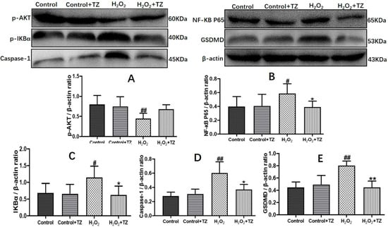 Terazosin inhibits cell apoptosis and pyroptosis in the Caco-2 cells. Terazosin influence on the levels of proteins p-AKT (A), NF-κB p65 (B), p-IKBα (C), caspase-1 (D), and GSDMD (E) in Caco-2 cells were verified by Western blot analysis. All data are represented as Mean ± SEM, # p < 0.05 and ## p < 0.01 as compared to Control group, * p < 0.05 and ** p < 0.01 as compared to H2O2 group.