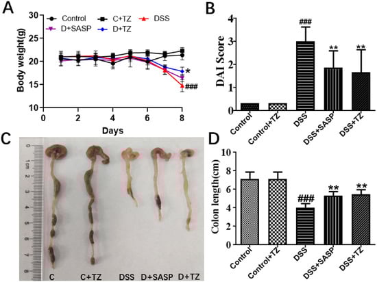 Terazosin (TZ) alleviated the clinical symptoms and representative photographs showing colon tissues in DSS-induced ulcerative colitis mice. (A) Body weight changes; (B) Disease activity index of mice treated with DSS and terazosin; (C,D) Changes of colon tissues in individual study groups and in colon length. All data are represented as Mean ± SEM, ### p < 0.001 as compared to the control group, ** p < 0.01 as compared to DSS group. SASP (salicylazosulfapyridine) was taken as positive control.