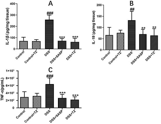 Effect of terazosin on the concentrations of pro-inflammatory cytokines. (A) Interleukin (IL)-1β, (B) Interleukin (IL)-18, and (C) Tumor Necrosis Factor (TNF)- α levels. All data are represented as Mean ± SEM, ## p < 0.01 and ### p < 0.001 as compared to the Control group, ** p < 0.01 and *** p < 0.01 as compared to DSS group. SASP (salicylazosulfapyridine) was selected as positive control.