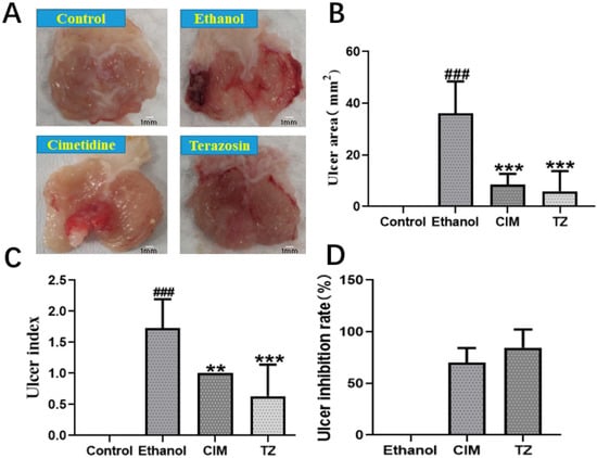 The effect of terazosin on the macroscopic appearance of the stomach mucosa (A), ulcer area (B), ulcer index (C), and ulcer inhibition (D) in ethanol-induced stomach mucosal injury in mice. The Control group exhibited no injuries to the gastric mucosa, The Ethanol group showed severe injuries to the stomach mucosa; CIM (80 mg/kg/day) and TZ (1 mg/kg/day) indicated mild disruptions of the surface epithelium in the gastric mucosa. All data are represented as Mean ± SEM, ### p < 0.001 as compared to the Control group, ** p < 0.01 and *** p < 0.001 as compared to the Ethanol group. Cimetidine was taken as the positive control in this work.