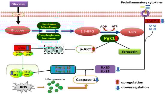 In order to further explore the detailed mechanism of terazosin regulation on NF-κB-GSDMD axis-mediated pyroptosis, p-AKT, p-IKBα, NF-κB p65, Caspase-1, and GSDMD were detected by Western blotting. Pyroptosis, a highly inflammatory form of lytic programmed cell death, with initiation via activation of caspase family, including caspase-1, caspase-4, caspase-5, and caspase-11, can be triggered by various diseases, such as ulcerative colitis [46]. As a critical nuclear transcription factor, NF-κB not only regulates pro-inflammatory genes (TNF- α, IL-1β, and IL-6) [47], but also controls the transcription of gasdermin D (GSDMD), which was identified by 2 independent screening approaches as a key effector of pyroptosis [48,49,50]. In most cells, NF-κB is present as a latent, inactive, and IκB-bound complex in the cytoplasm, and phorylation of IκB (IκBα and p100) is essential for NF-κB activation [51]. IκBβ is also targeted for phosphorylation on Ser19 and Ser23 through binding to the IKK complex (the core element of NF-κB cascade) [51]. The activity of NF-κB is primarily regulated by interaction with inhibitory IKB proteins, and its inactivation can alleviate the severity of UC [26,52]. Here, we observed that terazosin treatment significantly increased the phosphorylation of IκBα and subsequent translocation NF-κB p65 into the nucleus (p < 0.05, Figure 4). Meanwhile, we also found terazosin obviously blocked the release of IL-1β and IL-18, as well as attenuated pyroptosis in DSS-induced UC mice (p < 0.001 and p < 0.01, Figure 6). Reports indicated that the production of IL-1β and IL-18 depends on the Caspase-1 activity, our results confirmed terazosin treatment markedly inhibited Caspase-1 and GSDMD expression in H2O2-induced Caco-2 cells (p < 0.05, Figure 4). We also examined that the enhancement of p-AKT could reduce the expression of pyroptosis-related protein and alleviate UC injury, just consistent with previous report [53]. The findings show that terazosin protects UC by suppressing NF-κB-GSDMD axis-mediated pyroptosis through activating Pgk1, the new signaling pathway was illustrated in Figure 8.