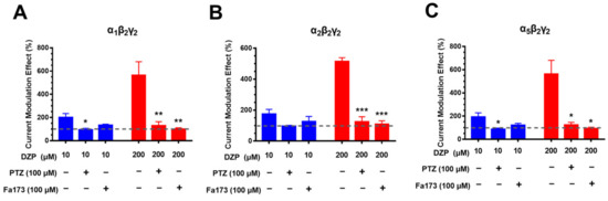 Pentylenetetrazol and Fa173 abolished the flumazenil-insensitive diazepam effects on ternary GABAARs. Effects of diazepam (DZP) in potentiating the GABA-elicited currents were evaluated at low (10 μM) and high (200 μM) concentrations in the absence or presence of pentylenetetrazol (PTZ, 100 μM) or Fa173 (100 μM) on the α1β2γ2 (A), α2β2γ2 (B) and α5β2γ2 (C) receptors. The dotted lines indicate the basal levels without drug treatment. Data represent mean ± SEM, n = 4, * p < 0.05, ** p < 0.01, *** p < 0.001 vs. control group, via t-test.