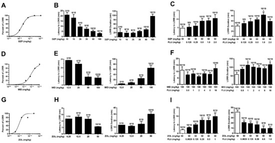 Flumazenil antagonized LORR induced by zolpidem, but not by diazepam or midazolam. A series of doses of diazepam (DZP), midazolam (MID) and zolpidem (ZOL) were administered intraperitoneally, and percentage of LORR (A,D,G) and latency to and duration of LORR (B,E,H) were recorded. Flumazenil (FLU) was intravenously injected immediately before BZD administration, and its effects on LORR induced by 50 mg kg−1 diazepam, 100 mg kg−1 midazolam or 50 mg kg−1 zolpidem were evaluated (C,F,I). Data represent mean ± SEM, n = 9−10. Figure on top of each bar is the number of mice that lost the righting reflex over the total number of the mice tested. One-way ANOVA; * p < 0.05, ** p < 0.01 vs control group, according to post hoc analysis with Dunnett’s multiple comparison test.