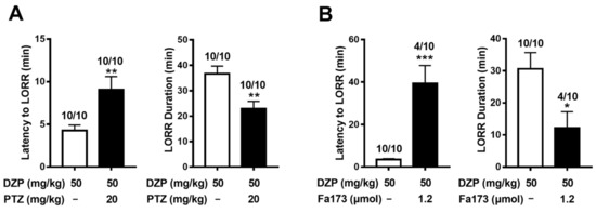 Pentylenetetrazol and Fa173 antagonized diazepam-induced LORR. Pentylenetetrazol (PTZ, 20 mg kg−1, i.v.) or Fa173 (1.2 μmol/mouse, i.c.v.) was injected immediately before diazepam (DZP, 50 mg kg−1, i.p.) administration. The effect of pentylenetetrazol (A) or Fa173 (B) on latency to and duration of diazepam-induced LORR were recorded. Data represent mean ± SEM, n = 10. Figure on top of each bar is the number of mice that lost the righting reflex over the total number of the mice tested. * p < 0.05, ** p < 0.01, *** p < 0.001 vs control group, via t-test.