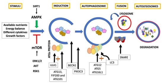 In general, classic autophagy consists of a series of dynamic membrane arrangements mediated by a group of Autophagy Related Proteins (ATG) [1,6]. First, cytoplasm sequestration is generated within double-membrane vesicles called autophagosomes [5,6,9]. ULK1 is an autophagy inducer [9,10,11], and forms the first complex of this pathway with ATG13, FIP200 and ATG101 [2]. Beclin1 (BECN1), acts as an autophagy regulator [9,10,11] and, in conjunction with phosphatidylinositol 3-kinase catalytic subunit type 3 (PIK3C3) and phosphoinositide-3-kinase regulatory subunit 4 (PI3KR4), promotes engulfment and endosome maturation [15]. ULK complex is mobilized to the endoplasmic reticulum favoring the formation of the phagophore and allowing the recruitment of WIPI2B that recruits the E3-like complex ATG12– ATG5–ATG16L1 [16]. This last complex promotes the conjugation of LC3 [17]. LC3 is a critical biomarker of autophagosome formation and expansion and, when conjugated with phosphatidylethanolamine, results in the formation of another autophagy marker LC3-II [9,10,11]. Subsequently, the autophagosome fuses with the lysosome to generate autolysosomes guided by SNARE proteins [16]. Finally, the intracellular components are rapidly degraded by autophagolysosomal hydrolytic enzymes [17] and the constituents are released for biosynthesis or for their use as an energy source [5,6,9] (Figure 1).