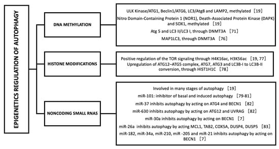 In the case of miRNAs, it has been shown that they are involved in many stages of autophagy, including autophagic induction, vesicle nucleation, vesicle elongation, vesicle retrieval and fusion, and they are also implicated in the regulation of upstream signaling pathways that can affect autophagy induction [19]. Several microRNAs are known to inhibit autophagy by decreasing the expression of autophagy-related mRNAs. In breast cancer cells miR-101 is a strong inhibitor of basal and induced autophagy [81,82,83]. MiR-376b inhibits autophagy by acting on ATG4 and BECN1 while miR-630 inhibits autophagy by acting on ATG12 and UV radiation resistance associated gene protein (UVRAG) [84]. MiR-30a can negatively regulate autophagic activity by binding to BECN1 by decreasing its expression [7]. Other miRNAs enhance autophagy by acting on anti-autophagic molecules mRNAs. For example, miR-26a acts on negative regulators of autophagy such as induced myeloid leukemia cell differentiation protein (MCL1), TAK1-binding protein 2 (TAB2), Cytochrome c oxidase 5A (COX5A ), Polymerase (RNA) III (DNA directed) polypeptide G (POLR3G) and two negative regulators of MAPKs such as Dual specificity protein phosphatase 4 (DUSP4) and Dual specificity protein phosphatase 5 (DUSP5), resulting in activation of MAPKs and increased BECN1 expression [85]. The miR-325 suppresses the caspase recruitment domain (ARC) (anti-autophagic protein) which may increase autophagic activity in mice models [7]. Since B-Cell Leukemia/Lymphoma 2 (BCL-2) can bind BECN1 and inhibit BECN1-dependent autophagy, miRNAs that target BCL-2 such as miR-182, miR-34a, miR-210, miR-205 and miR-21 could regulate autophagy [7]. Figure 3 presents some examples of epigenetic regulation of autophagy.