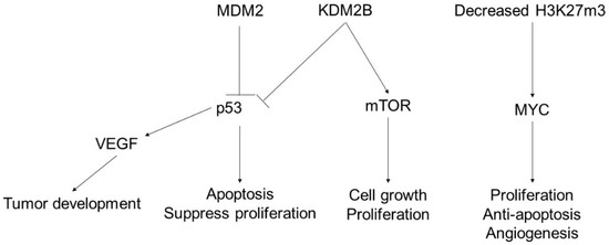 In angiosarcoma, p53 is a tumor suppressor that enhances apoptosis and suppresses tumor cell proliferation. The impairment of p53 function enhances VEGF function and causes tumor development. In addition, mTOR and MYC positively drive cell growth and angiogenesis. In these tumorigenesis mechanisms, KDM2B is upregulated in angiosarcoma, suppresses p53, and activates mTOR signaling. This leads to the suppression of apoptosis and enhancement of cell growth and proliferation. MYC upregulation is closely associated with radiation-related angiosarcoma due to H3K27me3 deficiency.