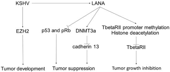 KSHV-associated LANA inactivates p53 and pRb, enhances cell cycle arrest, and causes tumor cell proliferation. LANA acts via methylation of the TbetaRII promoter and deacetylation of histones, which leads to the inhibition of TGF-β signaling. LANA cooperates with DNMT3a and facilitates promoter methylation of cadherin 13 to cause its downregulation in various tumors, leading to cell proliferation, tumor invasion, and suppression of apoptosis. Therefore, LANA-mediated cadherin 13 downregulation contributes to the development of Kaposi’s sarcoma. KSHV promotes tumor development mediated by EZH2 activation.