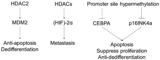 MDM2 is responsible for the development of dedifferentiated liposarcomas that cause antiapoptotic effects and the dedifferentiation of tumors. HDAC2 is co-expressed with MDM2, and HDAC2 inhibition results in decreased MDM2 expression and enhanced tumor cell apoptosis. CEBPA and p16INK4a act as suppressors of liposarcoma to induce apoptosis and suppress proliferation and dedifferentiation. Hypermethylation of CEBPA and p16INK4a is observed in liposarcoma and causes downregulation and enhances tumor development. HIF-2α activates gene transcription under hypoxic conditions and promotes metastasis in liposarcomas. Therefore, HDAC inhibitors inhibit tumor growth mediated by HIF-2α.