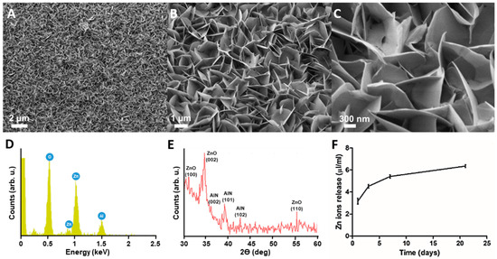 Characterization of ZnO NG arrays. SEM images of NSs grown for 9 h at 80 °C over an AlN layer of 100 nm at different amplification magnitudes: 1 KX, 5 KX and 20 KX (A–C); XRD measurement showing the high crystallinity of the NSs and the preferential orientation along (002) (D); Measurement EDS at the surface of the NSs, showing the presence of Zn, O and Al (E). Concentration of Zn ions released from the ZnO NSs array over time in culture medium (F).