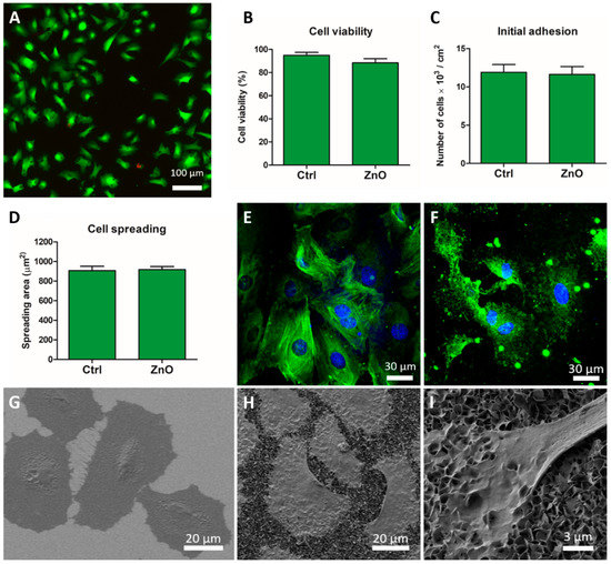 Smooth muscle (A7r5) cells grown on ZnO NG arrays. (A) Live (green) and dead (red) A7r5 cells cultured on ZnO NG array. (B) Percentage of viable A7r5 cells after 24 h in culture on ZnO NG arrays and glass coverslip (Ctrl), evaluated using Live/Dead viability/cytotoxicity kit. (C) Number of adhered cells and (D) mean spreading area of cells after 24 h in culture on ZnO NG arrays and glass coverslip (Ctrl). Confocal images of α-smooth muscle actin immunodetection (green) and nuclei (blue) of cells growing on glass coverslip (E) and ZnO NG arrays (F) for 24 h. SEM images of well-spread A7r5 cells on glass coverslip (G) and ZnO NG arrays (H,I) for 24 h. 2.3. ZnO cytocompatibility for skeletal myoblasts.