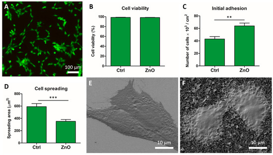 The development of smart materials for biomedical applications has become one of the most interesting research fields in recent years. Smart materials can be defined as materials that have one or more properties that can be changed in a controlled fashion by external stimuli, such as stress, temperature, moisture, pH, and electric, magnetic or ultrasonic fields [1,2,3,4,5]. Piezoelectric materials are smart materials that are able to generate a voltage when mechanical stress is applied, and vice-versa. Among all piezoelectric materials known, ZnO has attracted much interest because of its versatility, unique properties and multiple applications, including microelectronics, biosensors and tissue engineering [6,7,8]. The potential use of ZnO in the biomedical field is wide, with a high range of structures, from bulk material to different types of nanoparticles. In fact, it is already used in healthcare and cosmetic applications [8]. ZnO has been classified as a generally recognized safe material by the Food and Drug Administration (FDA) of the United States. However, there is still controversy about the cytotoxic effect of ZnO nanostructures, with different results depending on cell types and nanostructures, which should be elucidated before their use in biomedical applications.