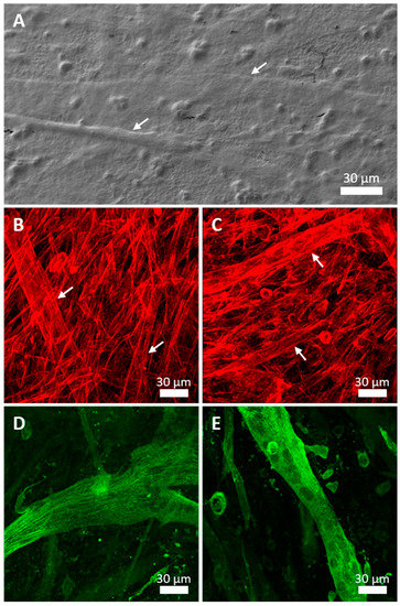 After 7 days in culture with the differentiation medium, it was possible to observe the fusion of several cells forming myotubes on both samples. To confirm that the structures observed were myotubes, the presence of sarcomeric α-actinin, a component of Z-disk in differentiated skeletal muscle myotubes, was analysed. Images showed that α-actinin were evident in differentiated myotubes in both substrates, without clear differences between them. Longitudinal myofilament bundles crossing the whole cell were detected (Figure 4D,E). In addition, a monolayer of undifferentiated myoblasts without α-actinin labelling or diffused signal were visible.