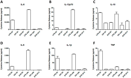 Cytokine release by macrophages analysed by the CBA test after 5 and 24 h of culture. Six types of cytokines involved in inflammation, IL-8 (A), IL-12p70 (B), IL-10 (C), IL-6 (D), IL-1β (E) and TNF (F), are shown in the presence of lipopolysaccharide (LPS, positive control), ZnO NG array, and a negative control.