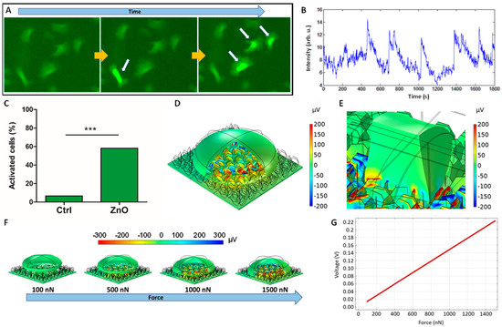 Frames of time-lapse video showing florescence due to calcium influxes in smooth muscle (A7r5) cells (A). Intensity of fluorescence indicating calcium influx in a certain A7r5 cell at timepoints: 5 min, 6 min and 7 min (B). Percentage of activated smooth muscle (A7r5) cells which undergo changes in intracellular calcium concentration (C); statistically significant differences are marked by three asterisks (p < 0.001). COMSOL simulations with the piezopotentials generated by a smooth muscle cell (D) and cylinder-like cell (E), corresponding to a sarcomere of a skeletal muscle fibre, when exerting a force of 1 µN. Simulation of smooth muscle cell shape and electric potential distribution (F) and values of the potential at the membrane (G) for different muscle forces.