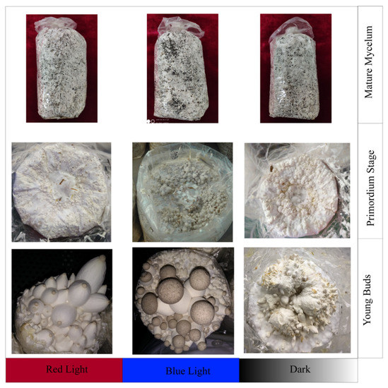 Cultivation bags fully covered by mature mycelium were cultured in the CNC cultivation house. As shown in Figure 1, the mycelia started to twist and form primordia after approximately 9 days under red light, blue light, and dark conditions. However, significant differences among the different light conditions were observed in the subsequent differentiation stage. Under dark conditions, the primordia exhibited a rough surface and had difficulty forming normal buds, producing malformed young buds without obvious pilei and stalks. In contrast, the primordia under red light and blue light conditions differentiated normally, and young buds were produced in greater abundance and faster under blue light than under red light.