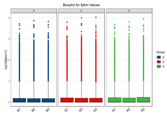 The raw Illumina sequencing data were deposited in GenBank under BioProject accession PRJNA759008. Table 1 provides an overview of the transcript-level data. After excluding low-quality reads, a total of 21.96 GB of clean data were obtained. High-quality reads showed a mapping rate of 91%, which was above the standard mapping rate of 70%. Moreover, the Q30 values of all sequences of the nine cDNA libraries exceeded 90%, and more than 90% of the bases were valid. Boxplots (Figure 2) showed that the three samples in each group yielded a concentrated range of values and that the sample similarity was high. The above results indicated that the transcripts of the nine primordium samples were all with high quality and could be used for subsequent analysis.
