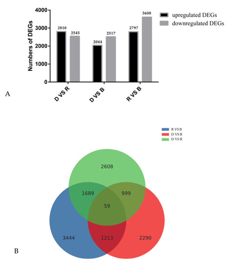 Gene expression comparisons. (A). The gene expression profile of DEGs. (B). Venn diagram of the number of differentially expressed genes (DEGs). The numbers of upregulated and downregulated genes between D vs. B, D vs. R, and R vs. B are shown.