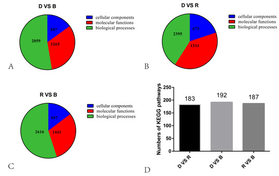 To investigate transcript differences during primordium differentiation among the different light conditions, DEGs among the groups were identified and annotated. A total of 16,321 DEGs were identified among the three conditions (Figure 3). Specifically, 2797 upregulated and 3608 downregulated in R vs. B, 2810 upregulated and 2545 downregulated in D vs. R, 2044 upregulated and 2517 downregulated in D vs. B. To determine the functions of these DEGs, GO enrichment analysis and KEGG functional annotation were performed, and the results are shown in Figure 4.