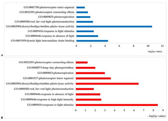 Gene Ontology (GO) database enrichment analysis of DEGs in primordium between blue light and red light. (A). DEGs upregulated under blue light. (B) DEGs upregulated under red light.