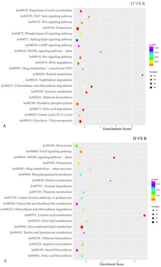 The top 20 enriched KEGG pathways of DEGs in primordium between blue or red light and darkness. (A). DEGs between D and R. (B). DEGs between D and B. The color intensity is proportional to the enrichment significance, and the circle size indicates the number of enriched genes.