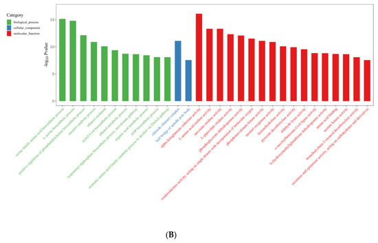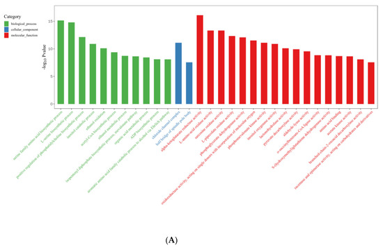 In the R vs. B comparison, 6406 DEGs were enriched in 4754 terms, including 697 terms in the cellular component category, 1441 terms in the molecular function category, and 2616 terms in the biological process category; the results are shown in Supplementary Tables S5 and S6. Figure 7A shows the top 30 GO enrichment terms of upregulated genes, which include 11 terms in the biological process category, 2 in the cellular component category, and 17 in the molecular function category (p < 0.05). Figure 7B shows the top 30 GO terms of downregulated genes, including 17 terms in the biological process category, 4 terms in the cellular component category, and 9 terms in the molecular function category. The terms serine family amino acid biosynthetic processes (GO: 0009070), L-serine biosynthetic processes (GO: 0006564), the positive regulation of phosphatidylcholine biosynthetic processes (GO: 2001247), acetyl-CoA biosynthetic processes (GO: 0006085), and ADP biosynthetic processes (GO: 0006172) showed significant enrichment during blue light induced primordium formation. Given the strong promotion of primordium differentiation under blue light, we conjecture that the positive effect of blue light illumination may be exerted through these biosynthetic pathways.