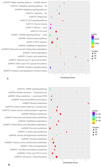 Enrichment analyses were performed based on Gene Ontology (GO) [54] and Kyoto Encyclopedia of Genes and Genomes (KEGG) annotation [55]. The number of differentially expressed transcripts allocated to each GO term was counted, and the significance of the enrichment of differentially expressed transcripts under each GO term was calculated using the hypergeometric distribution test. The test result returned a p-value, with a small p-value indicating significant enrichment of differentially expressed transcripts under that GO term. At the same time, multiple hypothesis testing correction with p-values was performed using the false discovery rate (FDR). KEGG (https://www.genome.jp/kegg/, accessed on 6 September 2018) is a major public pathway-related database. The significance of KEGG pathways was analysed using the hypergeometric distribution test, and the p-values were corrected using the FDR.